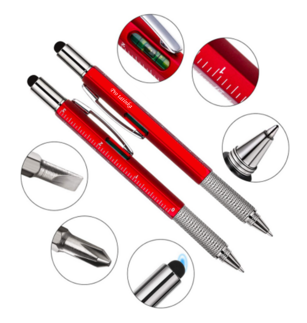 Propiska v moderním designu se hodí do práce i do školy. Kromě klasického psaní ji využijete k ovládání dotykového displeje. Naleznete také dva šroubováky – plochý a křížový. V těle pera je vodováha a pravítko s měřítkem. Samozřejmostí je klip k připnutí na blok, nebo kapsu košile.